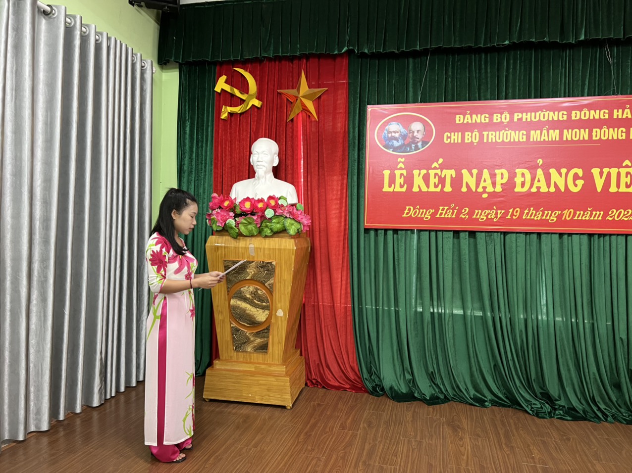 Thi hành Điều lệ Đảng cộng sản Việt Nam, thực hiện Quyết định của Ban thường vụ quận ủy Hải An, chiều ngày 19/10/2022 Chi bộ Trường Mầm non Đông Hải 2 tổ chức Lễ kết nạp Đảng viên mới cho quần chúng ưu tú Nguyễn Thị Vân Anh vào Đảng theo quy định của Điều lệ Đảng.