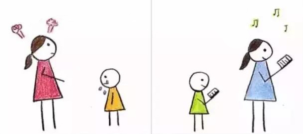 Cha mẹ bình thường (trái) luôn đánh giá cao quan điểm, thẩm quyền của mình, cho rằng ý tưởng của mình là đúng đắn và trưởng thành (vòng tròn lớn), trong khi ý tưởng của con trẻ là sai lầm, ngây thơ (vòng tròn nhỏ), giữa hai hệ ý tưởng không có sự giao thoa. Điều này cũng thể hiện việc họ muốn lấn át con, nhưng lại không sẵn sàng để tương tác. Quan hệ với trẻ là quan hệ kiểm soát.