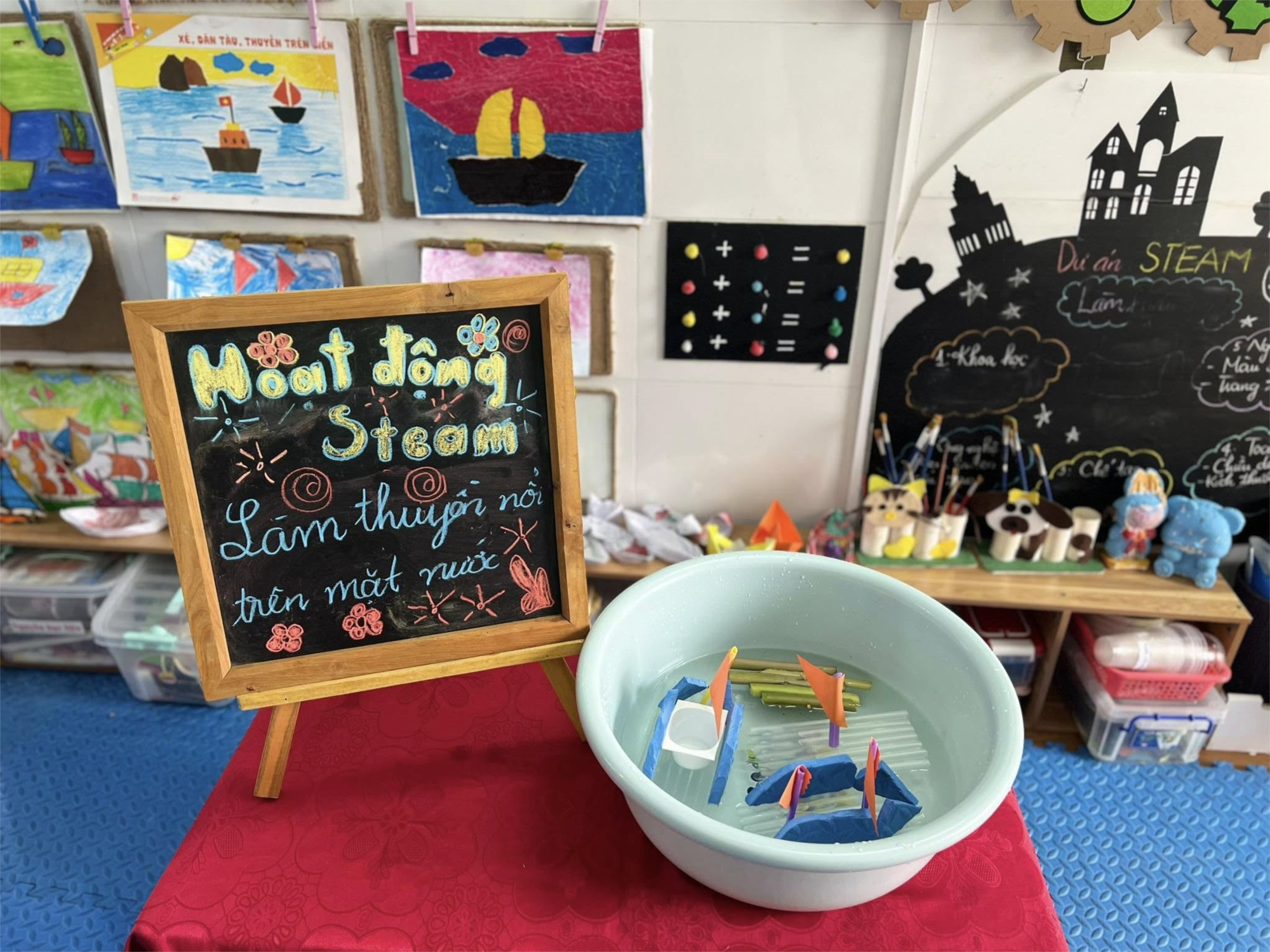 Ở chủ đề "Phương tiện giao thông đường thủy", hôm nay lớp 4A5 tổ chức hoạt động STEAM " Làm thuyền nối trên mặt nước". Các bạn nhỏ được thoả sức