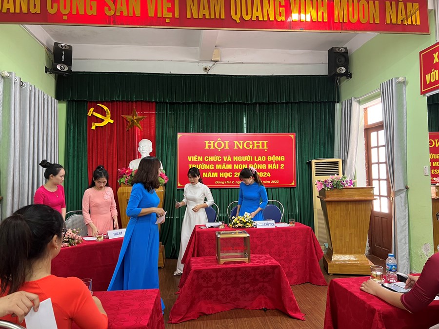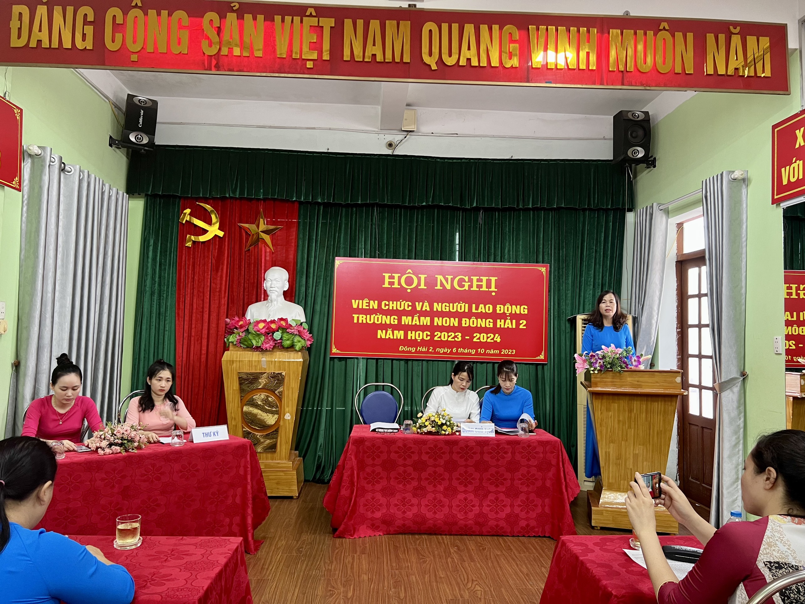 Sáng ngày 06/10/2023 Trường Mầm non Đông Hải 2 long trọng tổ chức Hội nghị Viên chức và người lao động năm học 2023-2024 nhằm đánh giá kết quả hoạt động của nhà trường trong năm học 2022 - 2023 đồng thời đề ra phương hướng, nhiệm vụ, giải pháp và các chỉ tiêu của năm học mới.