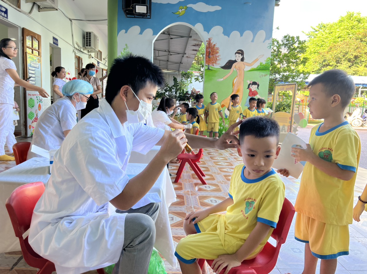 Sau đây là 1 số hình ảnh các bé trường mầm non Đông Hải 2 được các bác sỹ, y tá khám sàng lọc sức khỏe: